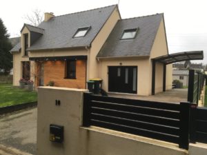 Nos équipes sont intervenues dans le cadre d’une rénovation chez un particulier résident à Caudan (56), en Bretagne. Celui-ci souhaitait renouveler ses menuiseries extérieures afin d’améliorer son confort, ainsi que leur designs. Lors de ce chantier, nos équipes ont réalisées la pose d’une porte d’entrée noir (RAL 9005) de la gamme Vision, modèle « BAGUIO ». La porte de garage, quant à elle à été choisis avec un système d’ouverture latéral. Elle est de modèle Locarno, et se compose de 3 hublots en inox. De plus, lors de ce chantier, nos équipes ont également installées 1 casquette aluminium noir 9005 avec éclairage, ainsi […]