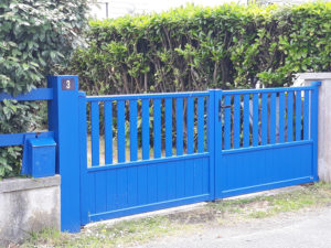 Installation d’un portail battant aluminium et d’une cloture assortie bleu (ral 5010) aux alentours de Pont L’abbé (29)