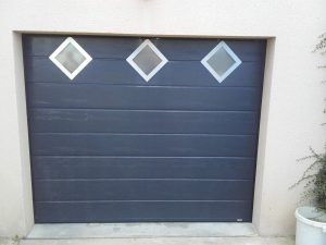 Pose d’une porte de garage sectionnelle gris 7016 avec hublots losange alu’nox Solabaie
