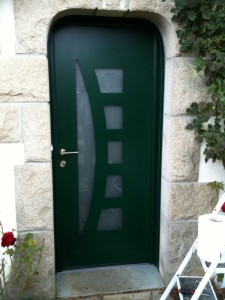 Installation d’une porte d’entrée couleur vert mousse. Porte moderne en aluminium avec vitrages.