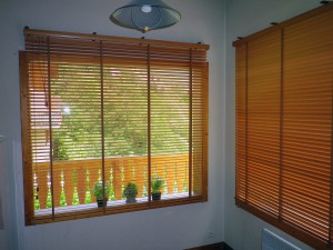 Installation d’un store intérieur à lames horizontales bois. Réalisation de la menuiserie Solabaie Alp’Fermetures.