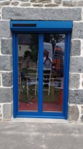 Pose d’une porte-fenêtre et de volets roulants coordonnés de couleur bleue, près de Loudéac, par la menuiserie Idéal Confort – Solabaie.